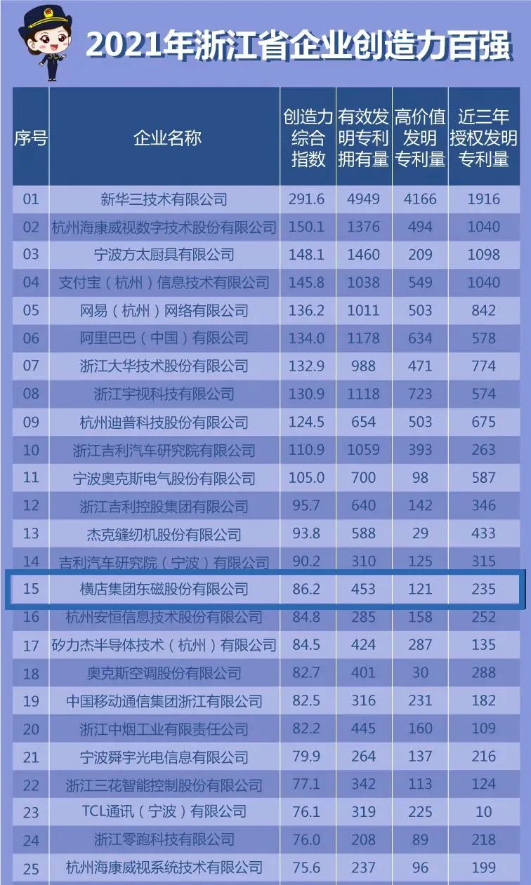 在世界知识产权日之际,浙江省市场监管局及金华市市场监管局,根据有效发明专利数量、高价值发明专利数量和近三年发明专利授权数量等指标,先后发布了省内和金华市内企业创造力排名。横店东磁以其优秀的创新能力,在各类榜单中名列前茅。