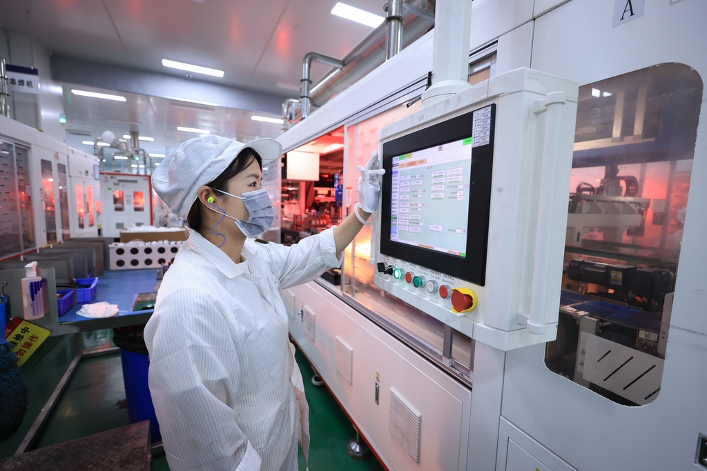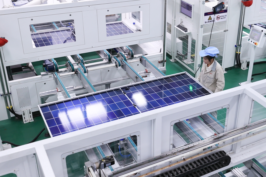配文:10月15日,江苏省连云港市赣榆经济开发区一家新能源企业,工人正在加紧生产一批出口海外的太阳能光伏电池组件。